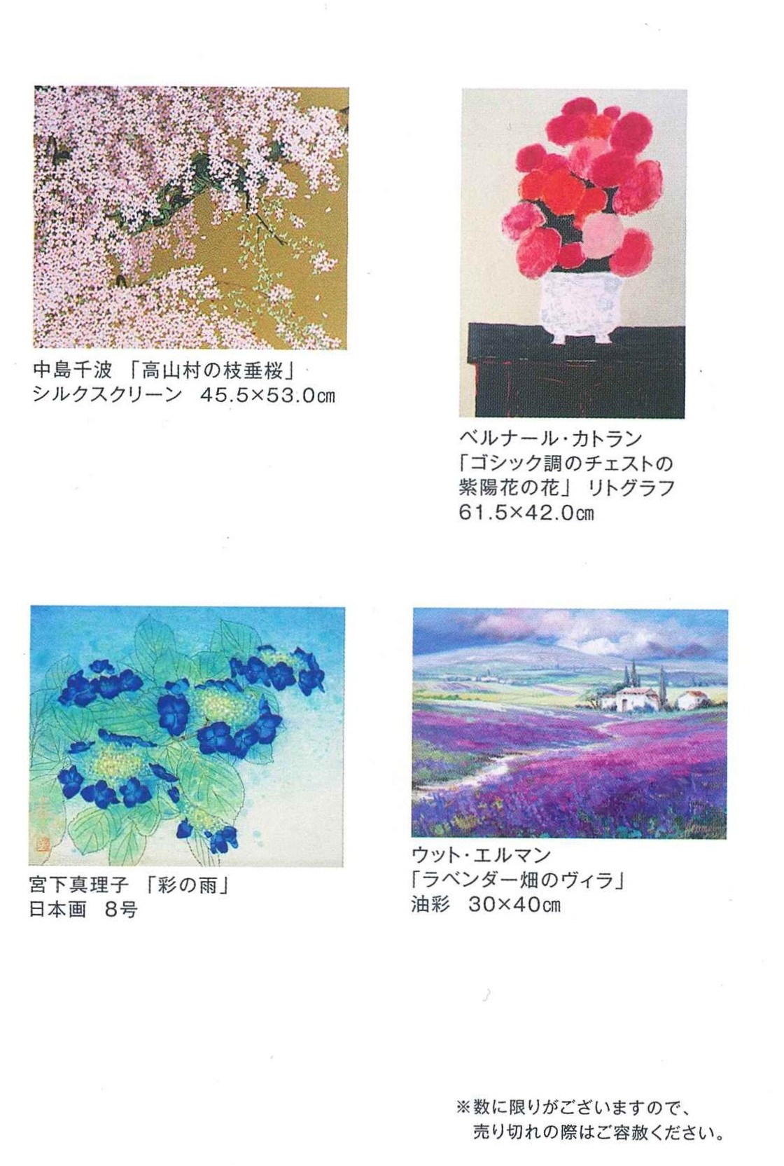 【展示会】 京王百貨店聖蹟桜ヶ丘店 「春の絵画祭」 会期 2026年3月19日(木)~3月24日(火) 10:00~19:30(最終日は16時閉場) 会場 京王百貨店聖蹟桜ヶ丘店 7階催場 東京都多摩市関戸1-10-1 日本画、洋画の原画・版画を一堂に販売いたします。こころ安らぐ作品の数々をお楽しみください。