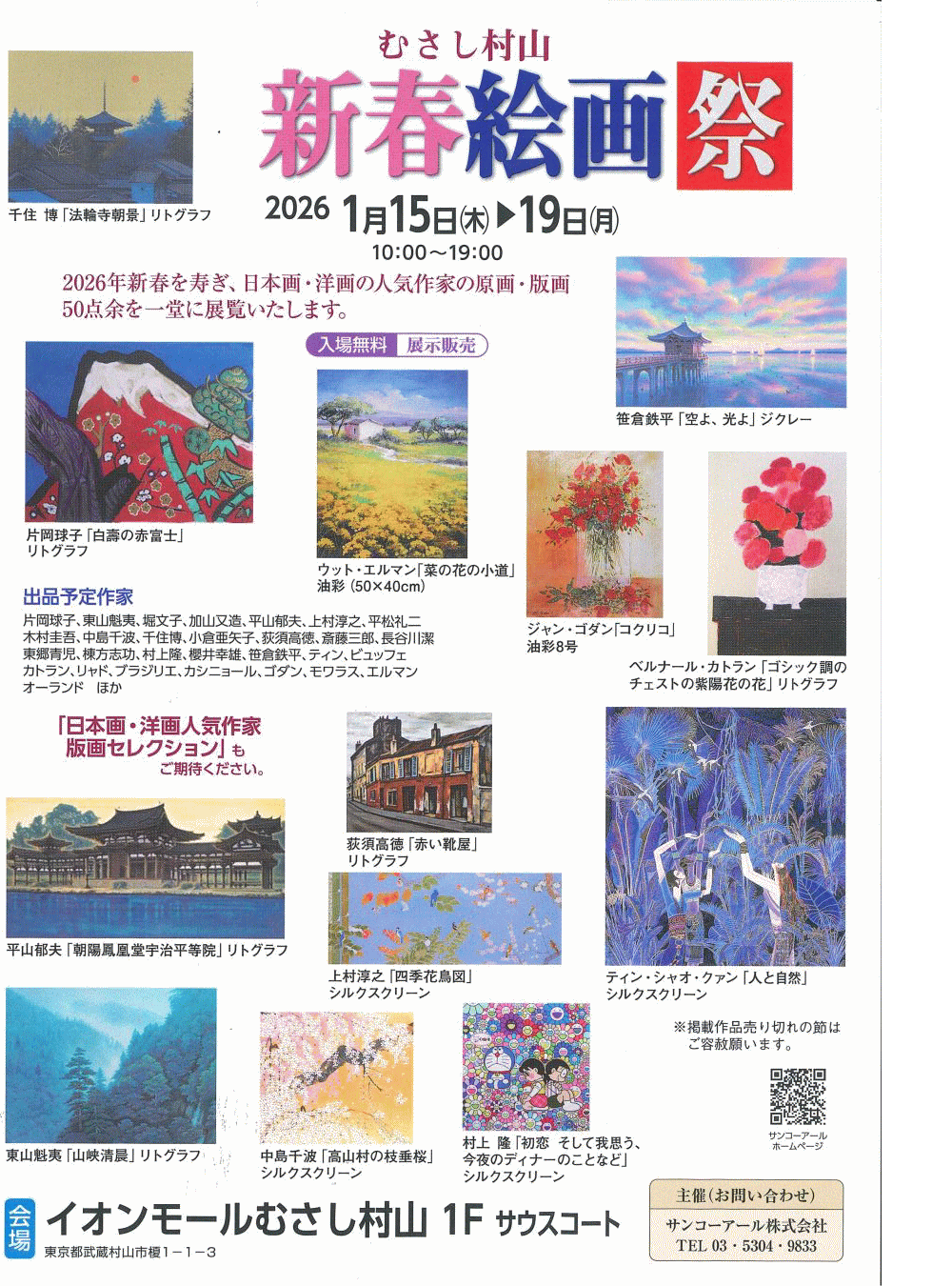【展示会】むさし村山 新春絵画祭 会期 2026年1月15日(木)~1月19日(月)10:00~19:00 会場 イオンモールむさし村山 1F サウスコート 東京都武蔵村山市榎1-1-3 新年初の絵画展を武蔵村山で開催いたします。新春ならではの晴れやかな絵を集め、皆様のお越しをお待ちしております。